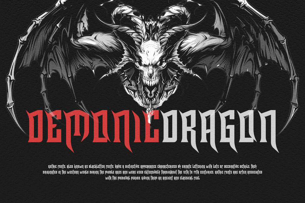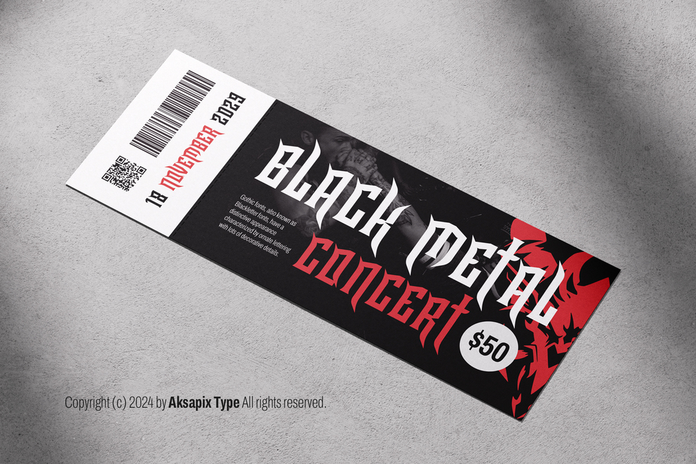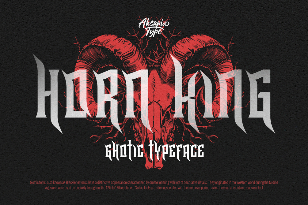 Create bold and dramatic designs with Horn King - Gothic Typeface. Whether you’re designing striking book covers, fierce metal band logos, or intricate tattoo art, Horn King brings a gothic flair to your projects.