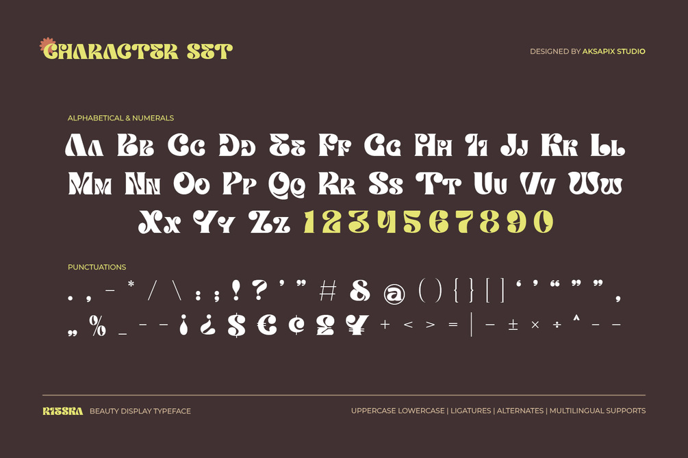 With 237 meticulously crafted glyphs, Rieska offers a wide range of characters and symbols to suit your creative needs, allowing you to create beautiful and unique compositions with ease.